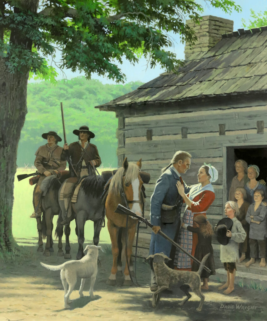 This amazing work of art, commissioned specifically for the TSDAR by renowned artist David Wright, illustrates the heartfelt moment a man departs to go fight in the American Revolutionary War. He reluctantly leaves his wife and children, not knowing if he will return or if his family will survive. At first glance, only one patriot is apparent but upon closer inspection the story unfolds with many patriots who embraced the fight. Throughout the war, men, women, and children courageously sacrificed for both their freedom then and ultimately for our freedoms today.
