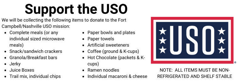 • Support the USO: We are collecting snacks and paper products on Friday and Saturday to donate to the Fort Campbell/Nashville USO mission.  All items must be non-refrigerated and shelf-stable  You may find a complete list of requested items on our Conference website.  Drop-off your donations at the USO table in the Conference Shops located in the Mustang/Palomino/Quarterhorse Room from 8 AM to 4 PM on Friday and Saturday