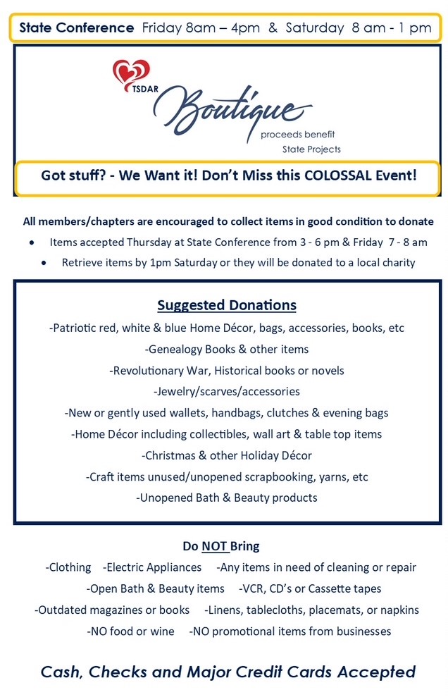The Sales Room will have a variety of items for sale from DAR and external vendors. President General and State Regent products and jewelry. Our Junior Shoppe will showcase a variety of goodies including t-shirts, stationery, and accessories to support the Helen Pouch Fund. The C.A.R. will have pins, membership and project information. You will be able to purchase Insignia at the Pop-Up Shop.
